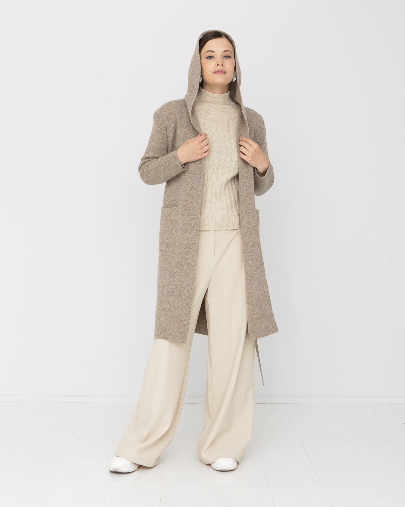 открытое пальто до колен с капюшоном и внешники карманами на поясе