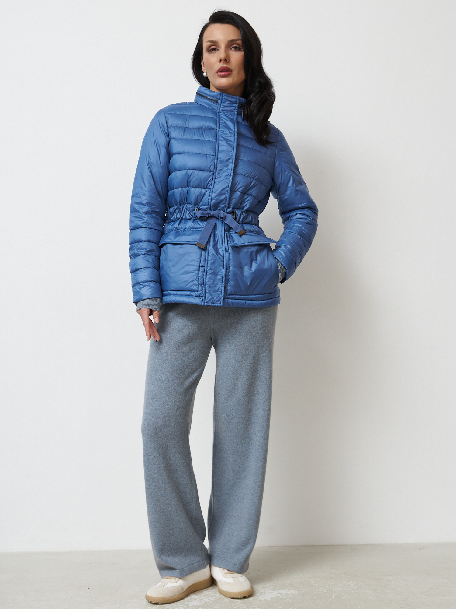 Женская куртка серо-голубого цвета выполнена из легкого и утепленного материала, идеально подходящего для межсезонья. Модель оснащена регулируемым поясом на талии, что подчеркивает фигуру и добавляет элегантности. Внутренние и внешние карманы позволяют удобно хранить необходимые мелочи. Воротник-стойка и молния с планкой обеспечивают дополнительную защиту от ветра. Куртка сочетает в себе стиль и комфорт, подчеркивая женственность и утонченность образа.